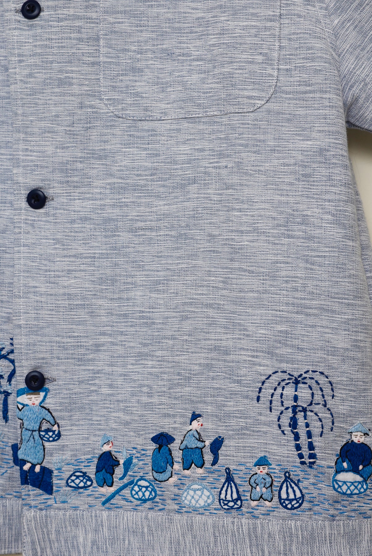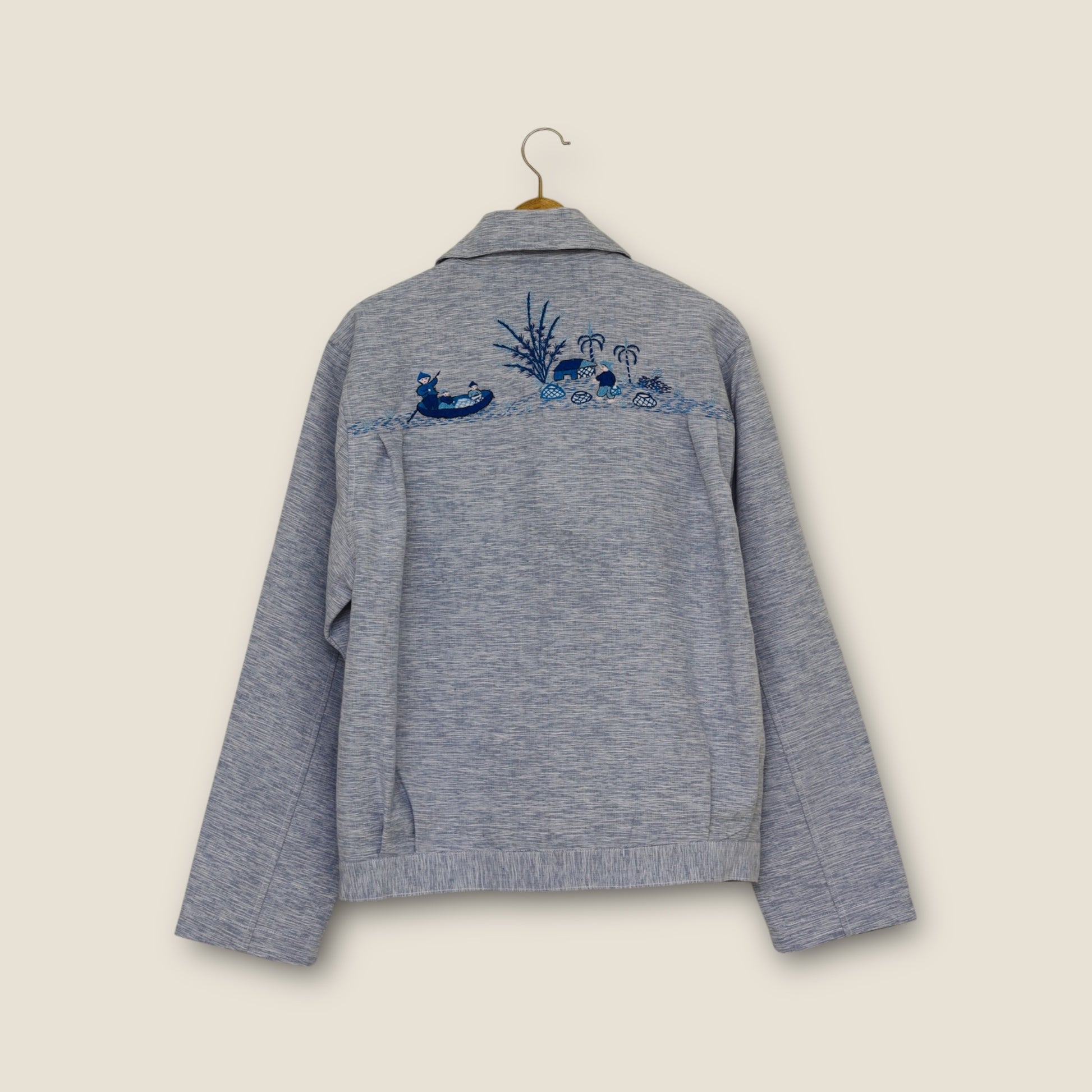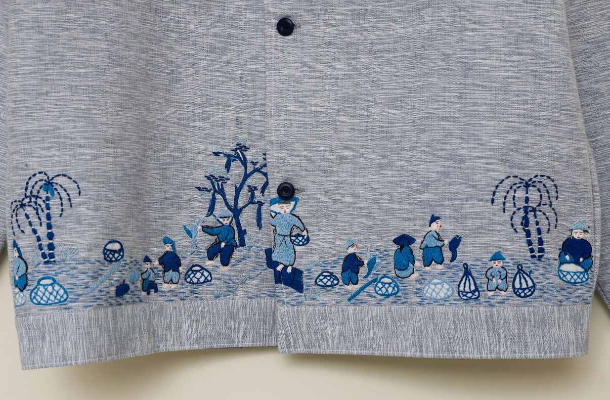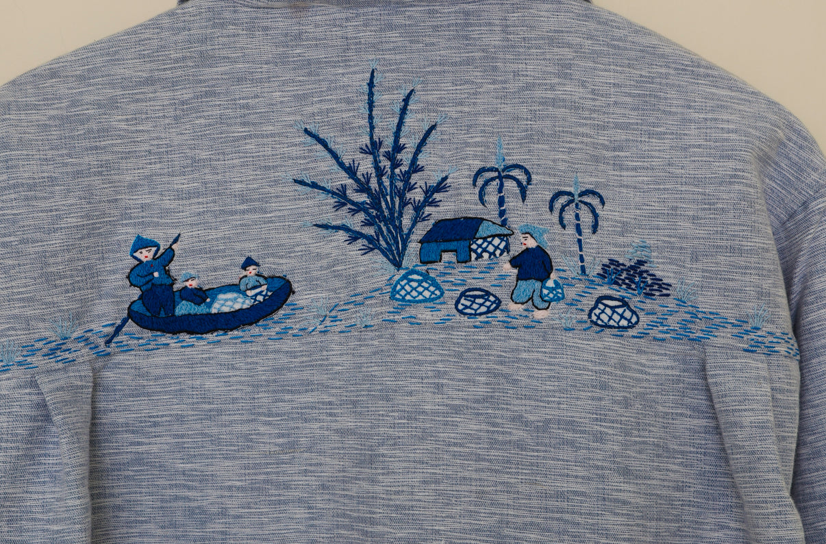 The surface features kantha embroidery artwork interwoven with hand-embroidered details restored from a vintage Japanese textile, depicting a fisherman community—a story of resilience, livelihood, and human connection told through thread.