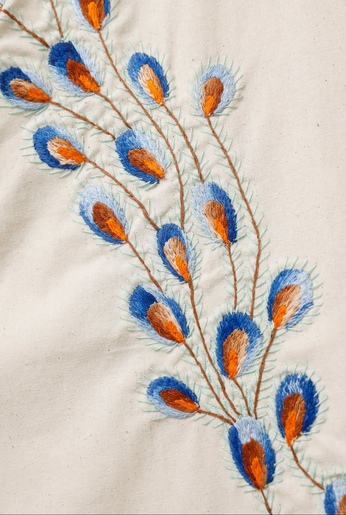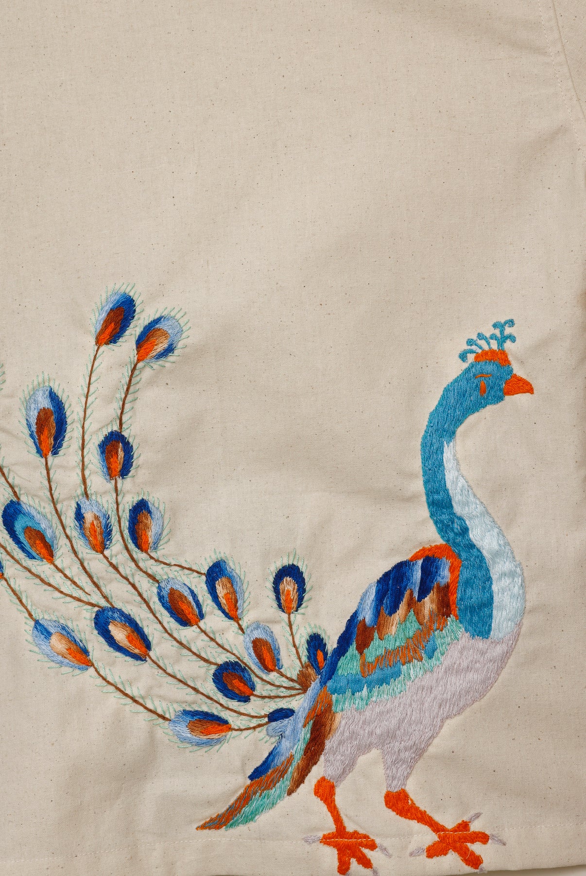 Cut in a relaxed, boxy silhouette with a cropped length, it features natural wood buttons and intricate hand-embroidered peacock motifs on the back and front —symbols of grace, beauty, and heritage.